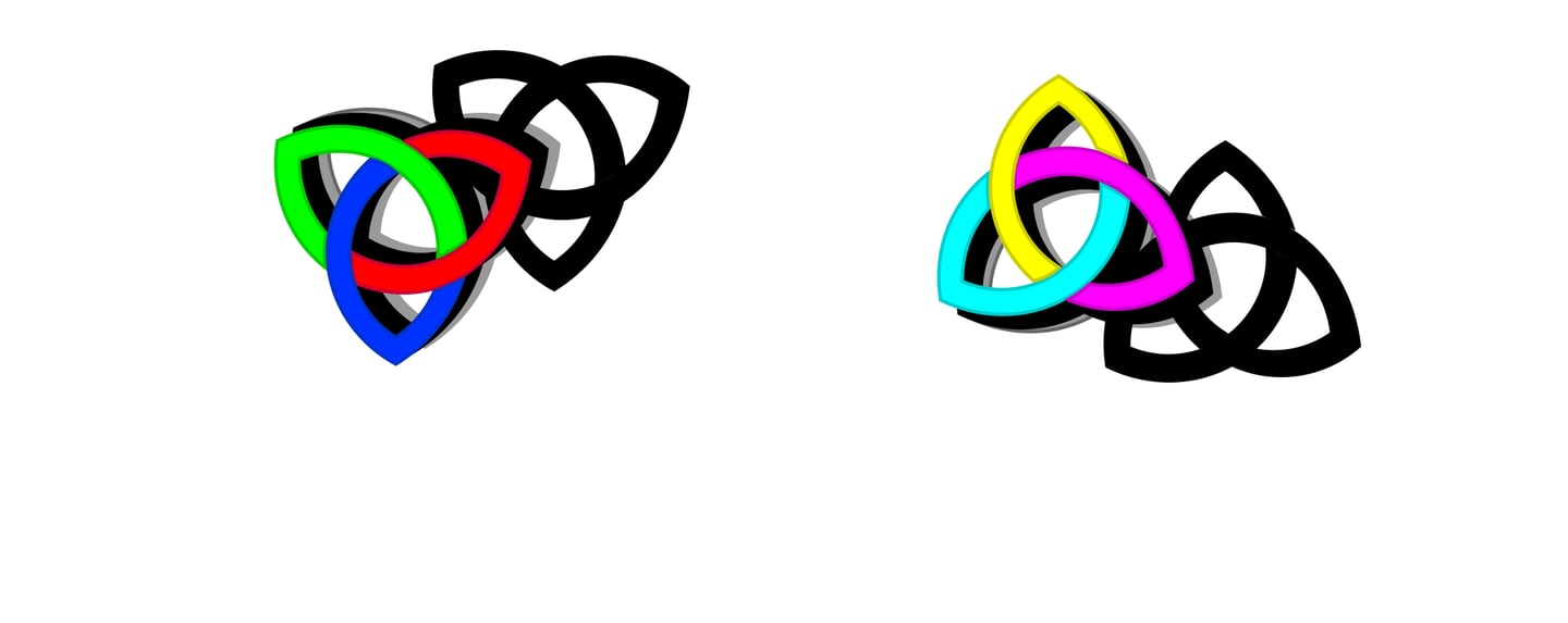 The Interference: Notice where the loops overlap. In the RGB knot, they create the CMY colors. In the CMY knot, they create the RGB colors. They are intertwined—you cannot have the "Energy" of the screen without the "Matter" of the color theory.